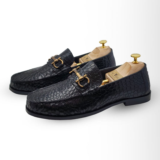 Elevate your footwear collection with the exquisite Piel Cuero Black Croc-Embossed Genuine Leather Horsebit Loafers. Crafted for the discerning gentleman, these loafers seamlessly blend timeless elegance with contemporary style.Each pair...