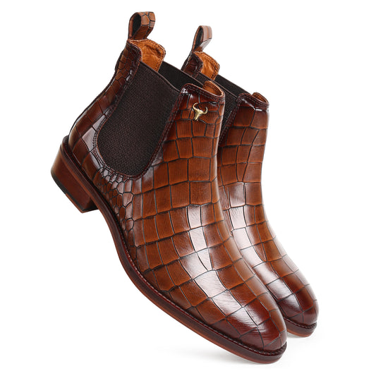 Add refined edge to your wardrobe with the Piel Cuero Men’s Brown Deep Cut Croco Print Embossed Leather Chelsea Boots. Crafted from premium leather with a deep cut croco print...