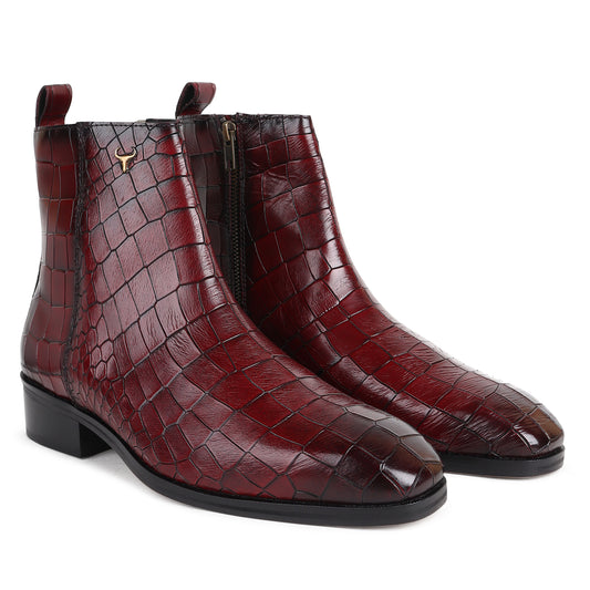 Turn heads with the Piel Cuero Men’s Cherry Deep Cut Croc Print Embossed Leather Chelsea Boots. Crafted from high‑quality Cherry leather with a deep cut croc print embossing, these boots...