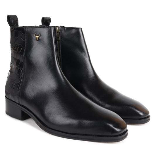 Elevate your everyday style with the Piel Cuero Men’s Black Croco Plain Side Zipper Chelsea Boots, crafted from rich full‑grain plain black leather paired with croco embossed leather side panels....