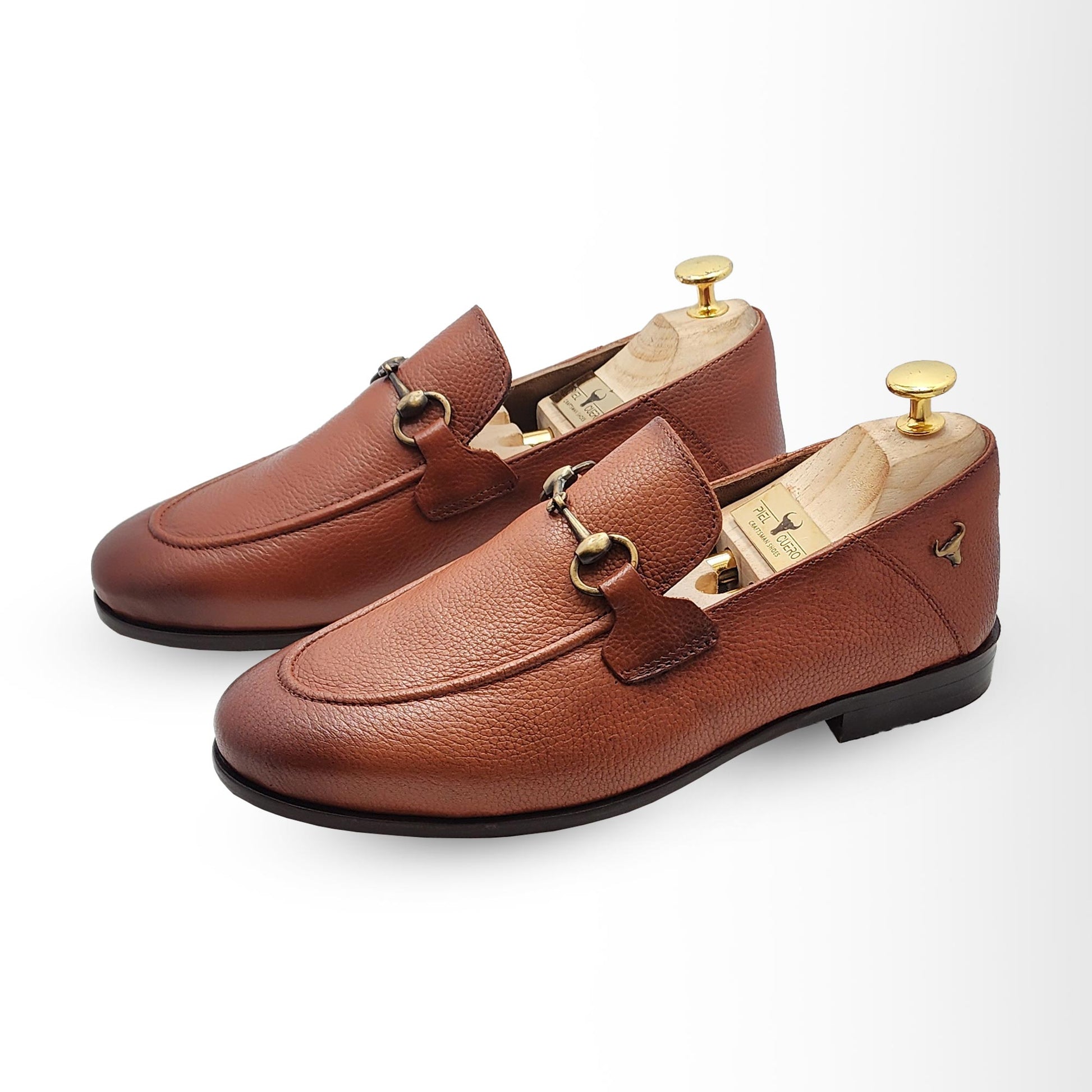 Step into sophistication with the Piel Cuero light brown leather loafers, expertly handcrafted for men who appreciate classic luxury and lasting comfort. Made from premium, pebbled full-grain leather, these loafers showcase a rich, warm brown hue that effortlessly complements both formal and casual outfits. Designed with a timeless silhouette, each pair features a striking horsebit metal accent atop the vamp, adding an elegant touch to the refined look. Inside, a luxury wooden shoe tree maintains the shape and maximizes the longevity of the loafer, reflecting artisan craftsmanship in every detail. The durable leather sole provides reliable traction and comfort for everyday wear, making these shoes a versatile choice for business meetings, evening events, or daily errands. Finished with subtle branded hardware, these loafers are the perfect balance of style, tradition, and modern elegance. Elevate any outfit with the timeless appeal and quality construction of Piel Cuero leather loafers, where comfort and luxury meet impeccable style.