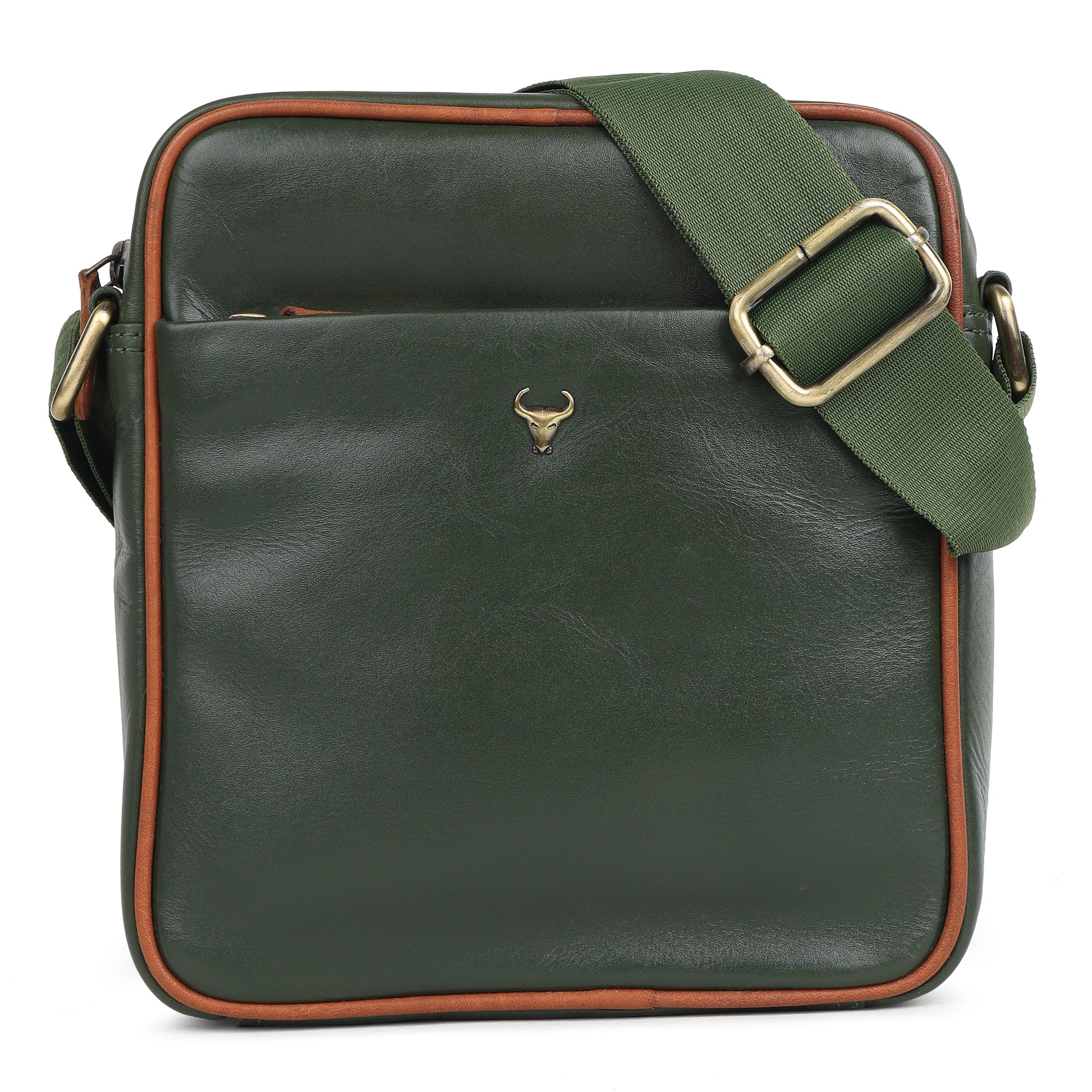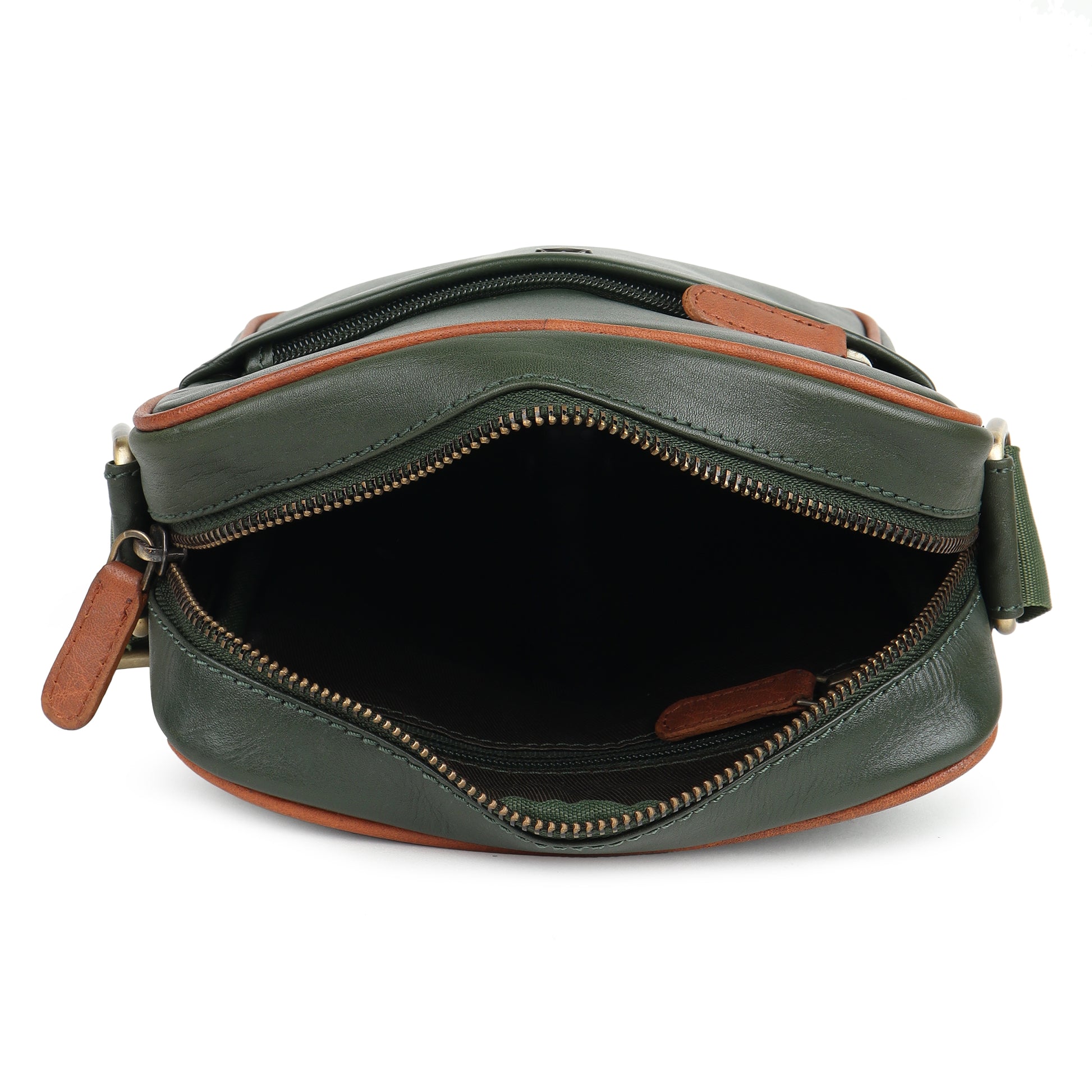Elevate your everyday carry with the Piel Cuero Green Genuine Leather Crossbody Bag. Masterfully handcrafted from rich, pure leather, this side bag combines timeless style with modern functionality. It's the perfect size for keeping your essentials secure and accessible without the bulk. Features a distinct dark green leather body that is supple, durable, and designed to age beautifully, developing a unique patina over time. The classic square silhouette is accented with bold tan brown leather piping along the edges, creating a sophisticated and eye-catching two-tone effect. The front is adorned with the iconic Piel Cuero metallic bull-head logo, a symbol of quality and craftsmanship. Equipped with sturdy, antique brass-tone zippers and leather pull tabs for smooth, reliable access to your belongings. The bag offers a spacious main zippered compartment with a wide opening to easily store your wallet, keys, phone, and other daily necessities. A convenient front exterior zippered pocket provides a secure spot for items you need to grab quickly, like transit cards or earbuds. The durable, adjustable green canvas shoulder strap ensures a comfortable, customized fit, allowing you to wear it as a crossbody or over the shoulder for hands-free ease. From the reinforced stitching to the robust metal hardware, this bag is built to last, making it the ideal companion for daily commutes, travel, or casual weekend outings. Experience the difference of handcrafted luxury. The Piel Cuero Crossbody is more than just a bag—it's an essential statement piece for the modern individual.